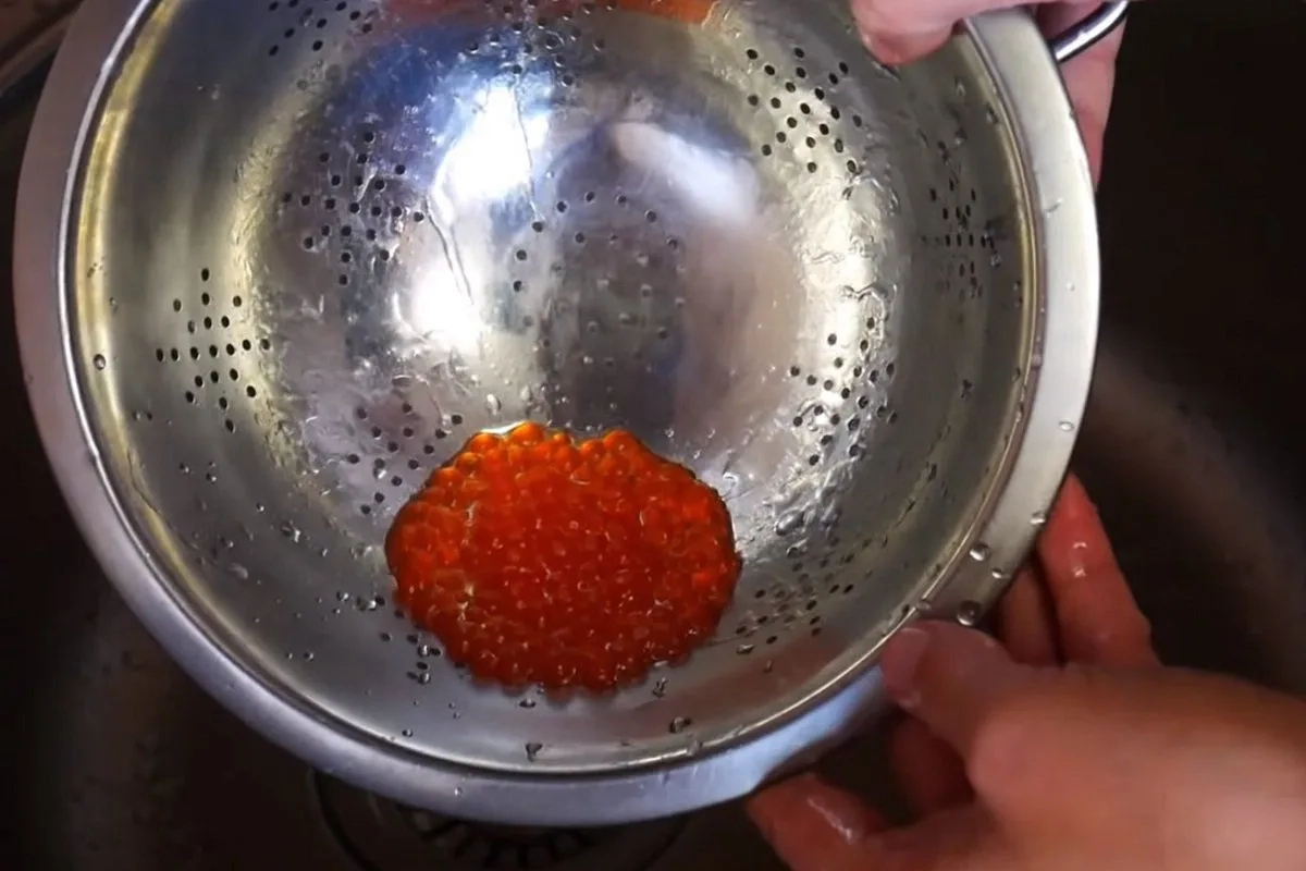 Утворені «ікринки» відокремлюють від олії через дрібне сито та промивають під струменем води.
