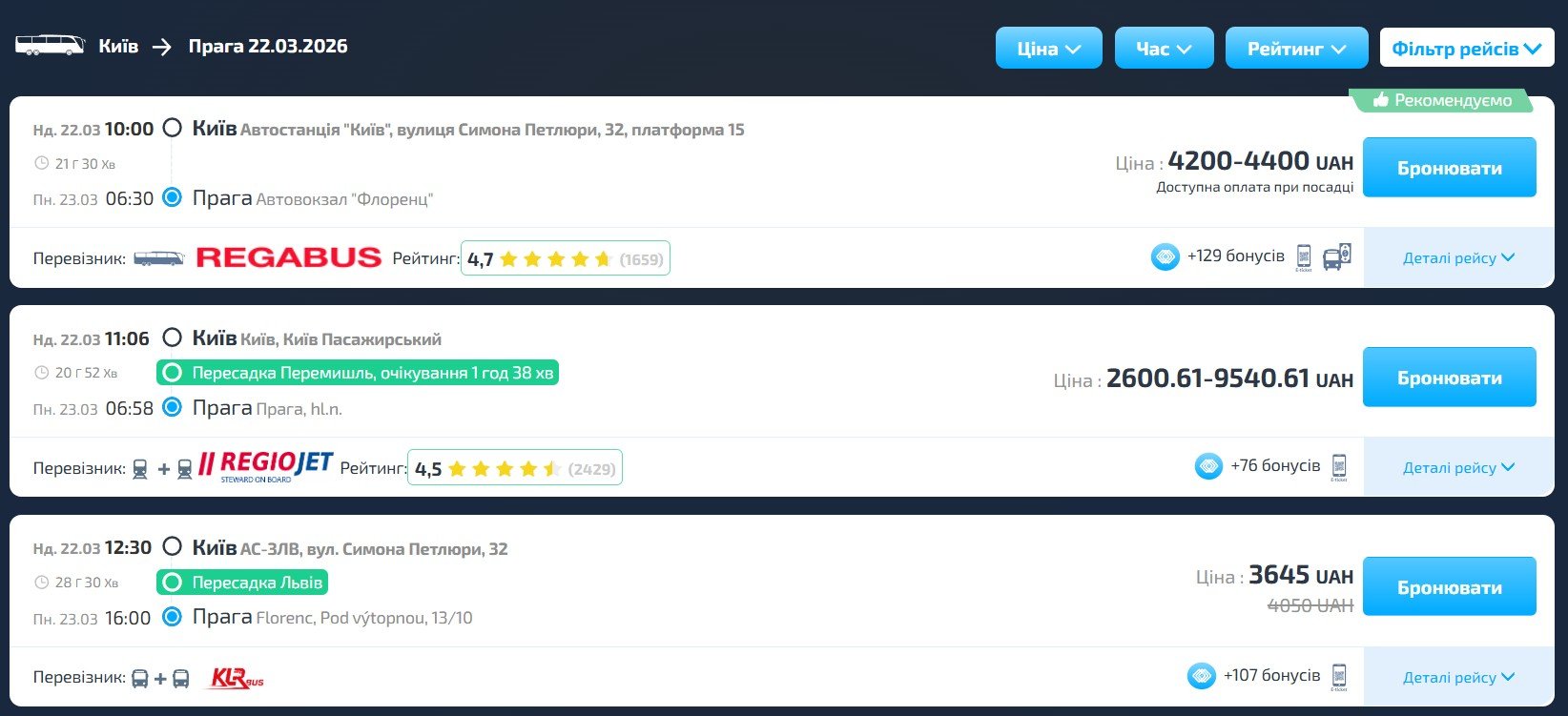 РекламаУ цьому сервісі можна швидко знайти автобуси між різними містами або навіть країнами. Тут видно розклад, час відправлення і варіанти від різних перевізників, тому легко вибрати той рейс, який підходить найбільше.