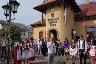 Відтак перед будівлею міськради учні Тячівської ЗОШ І-ІІІ ст. з угорською мовою навчання привітали учасників урочистостей традиційним осіннім дійством під назвою Сюреті-бал – угорським національним святом збору врожаю.