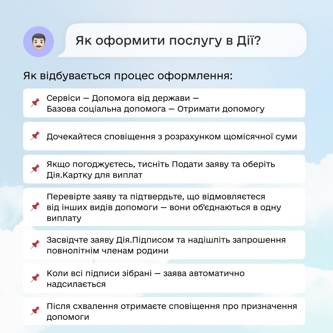 Нижче на інфографіці поданий алгоритм, як у Дії оформити базову соціальну підтримку.