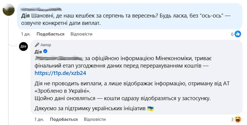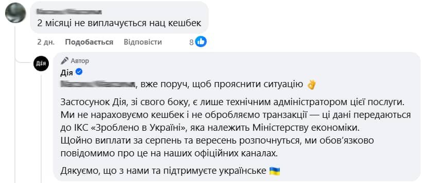 Інший дописувач так само звернув увагу, що грошей немає вже 2 місяці. Для нього уточнили, що застосунок «Дія» не обробляє транзакції, а тільки надає інформацію. Актуальну інформацію, за їх словами, можна дізнатись у Міністерства економіки.