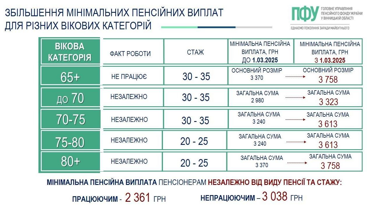 - мінімум 3758 гривень, якщо людина досягла 65 років, вже не працює та має страховий стаж 30/35 років (жінки/чоловіки),