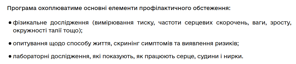 Національний скринінг передбачає не лише здачу аналізів, але й інші послуги. Наприклад, якщо в пацієнта виявлять якісь відхилення чи ризики, то одразу ж видадуть направлення до потрібного спеціаліста, а сиситема буде відстежувати виконання цього маршруту.