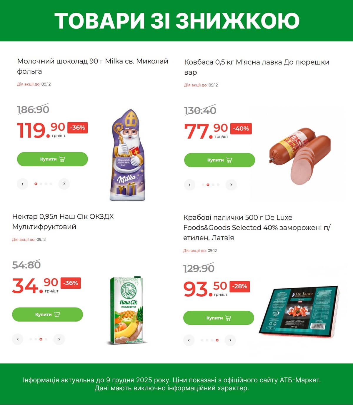 Наразі на офіційному сайті мережі супермаркетів доступно два списки товарів, які до 9 грудня продаватимуть дешевше. У першому списку містяться такі пропозиції: