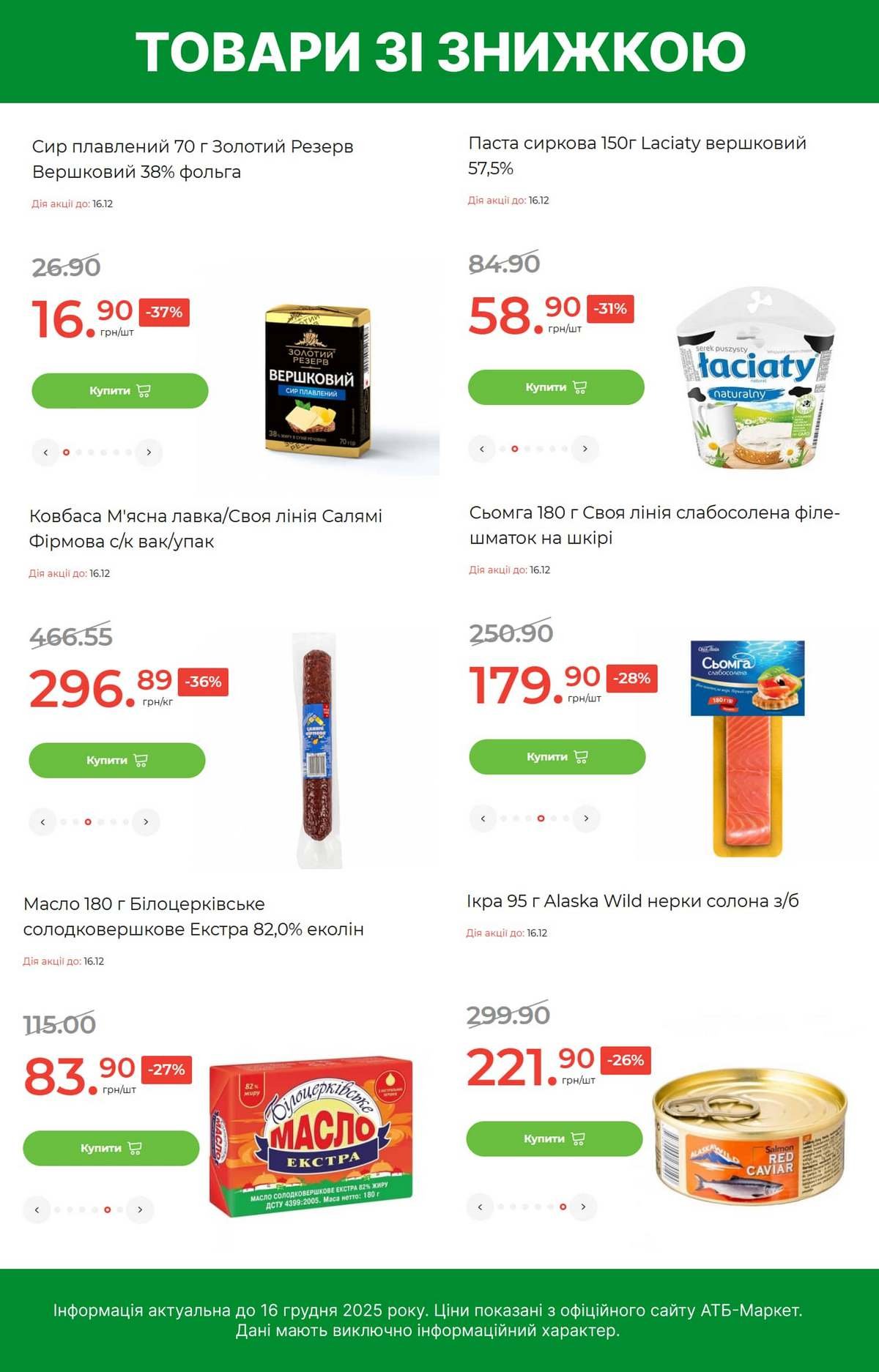 Зараз у списку 6 дешевих продуктів, порівняно з попередньою їх вартістю. АТБ-Маркет детально описує їх на офіційному сайті, показує їх фото, вагу, склад, виробника та безліч іншої інформації. Ці дані повинні стати вирішальними при ухваленні рішення покупцем щодо їх купівлі.