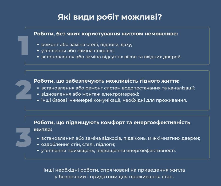 Допомога передбачає проведення найбільш необхідних ремонтів, аби житло ВПО стало зручним та безпечним. Тому програма покриває встановлення вікон, дверей, ремонт даху, утеплення помешкання, проведення води, каналізації, електрики ті інші базові ремонти.