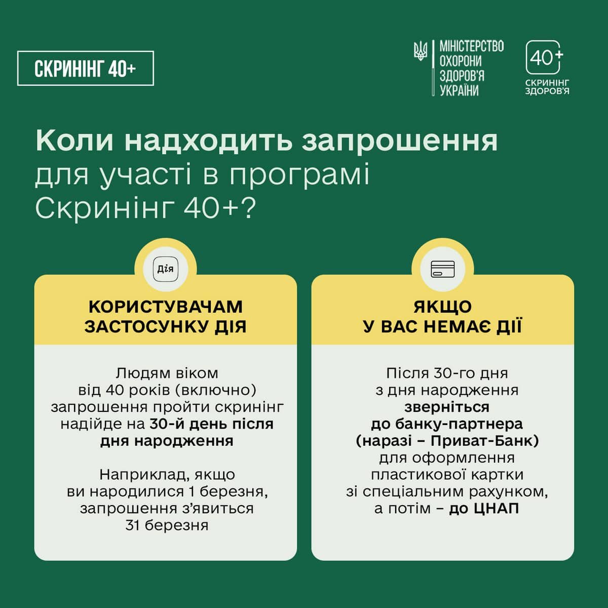 Українців просять звернути увагу, що нарахування можливе для всіх громадян, старших за 40 років. Тобто, і в 45, 50, 55 років і так далі. Але тільки на скринінг здоров’я дозволено витратити надані державою 2000 гривень.