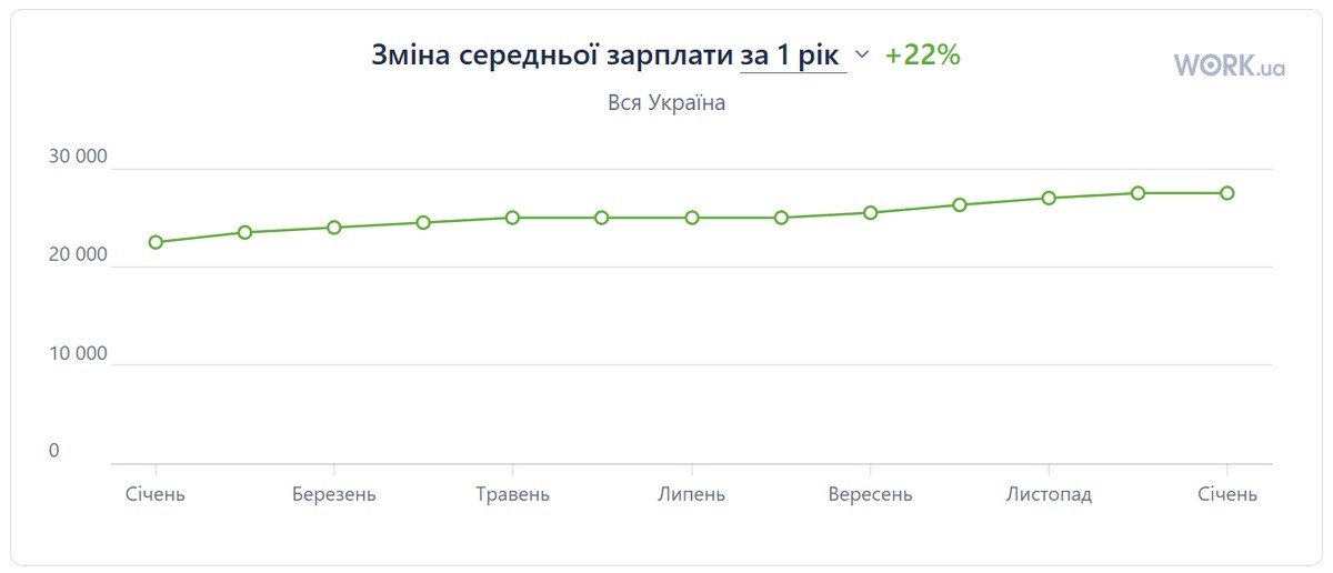 Портал Work.ua на основі аналізу понад 180 тисяч вакансій подає дані, що зараз в Україні середня зарплата становить близько 27500 гривень. Цей показник за останній рік трохи зріс і це підвищення було плавним, а не стрімким.