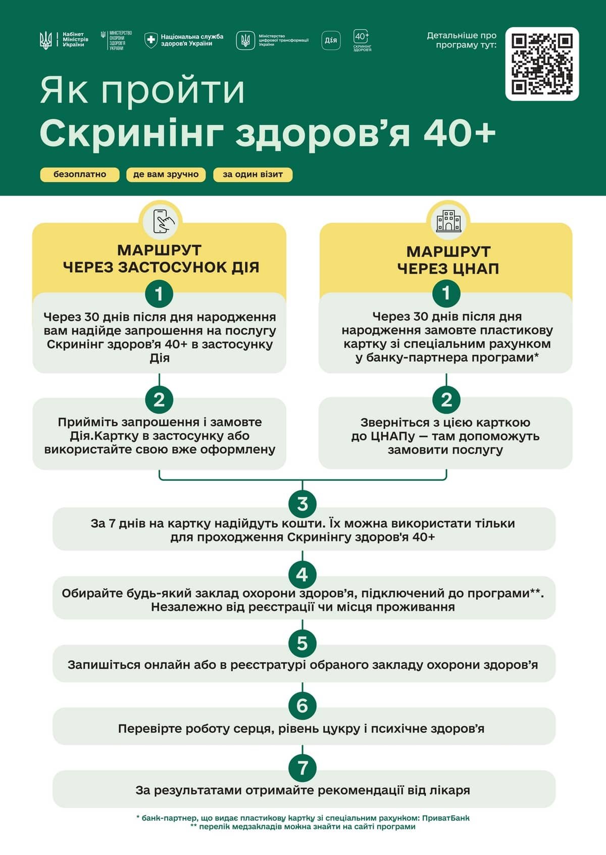 Українці, які встановили Дію на телефоні, із січня цього року мають змогу оформити 2000 гривень на скринінг здоров’я. Гроші надаються для людей у віці від 40 років на спеціальну картку. Держава на 30-й день після дня народження сама надсилає запрошення долучитися до програми, користувачу потрібно лише підтвердити участь. Коли це буде зроблено, упродовж 7 днів 2000 гривень нарахують на Дія.Картку.