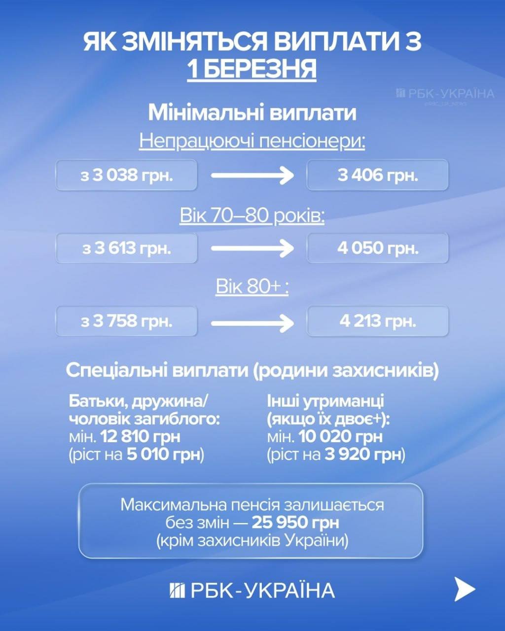 Міністр соцполітики Денис Улютін у коментарі виданню «РБК Україна» зазначив, що з 1 березня мінімальна виплата для непрацюючих пенсіонерів становитиме 3406 гривень. Верхню межу цього року не змінюють і вона залишиться на рівні 25950 гривень. Але для військовослужбовців є виняток, адже в цьому випадку діє спеціальний закон.