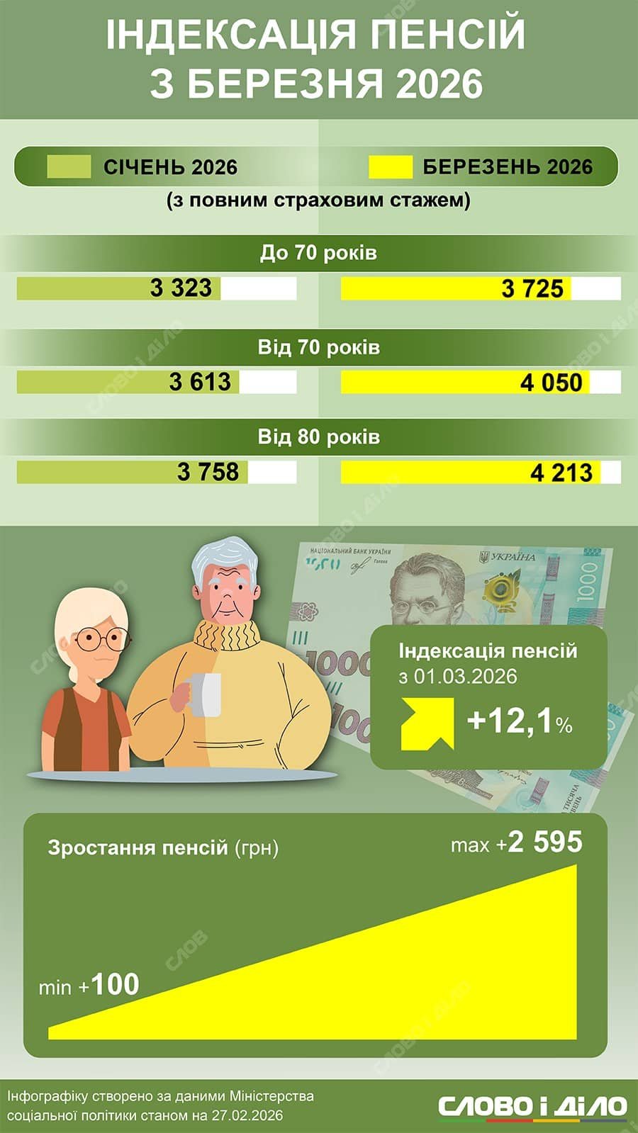 - Пенсіонери віком від 80 років, які отримують виплати за цим же законом і мають страховий стаж 20/25 років – розмір підвищено з 3758 до 4213 гривень (+455 грн).