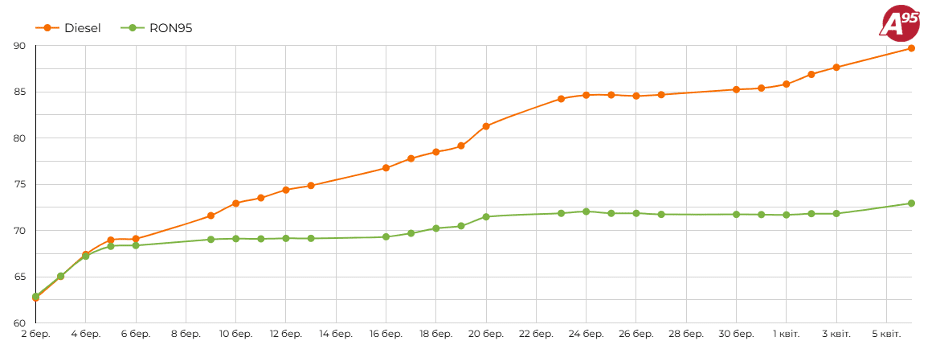 Беручи до уваги нові закупівельні ціни, вартість дизпалива й надалі зростатиме. Психологічна ціна у 100 гривень за літр лише питання часу. Цю позначку пальне може «пробити» вже у квітні й сумнівів експерти профільного видання в цьому не мають.