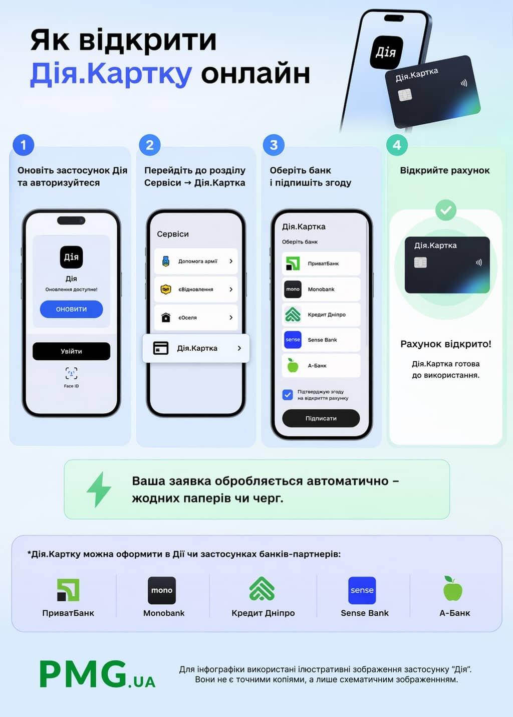 Якщо хтось немає спеціальної віртуальної картки, то її необхідно відкрити в одному із 6 банків. Редакція PMG.ua спеціально підготувала інфографіку, як це зробити. Річ у тім, що виплату надають першочергово на «Дія.Картку».