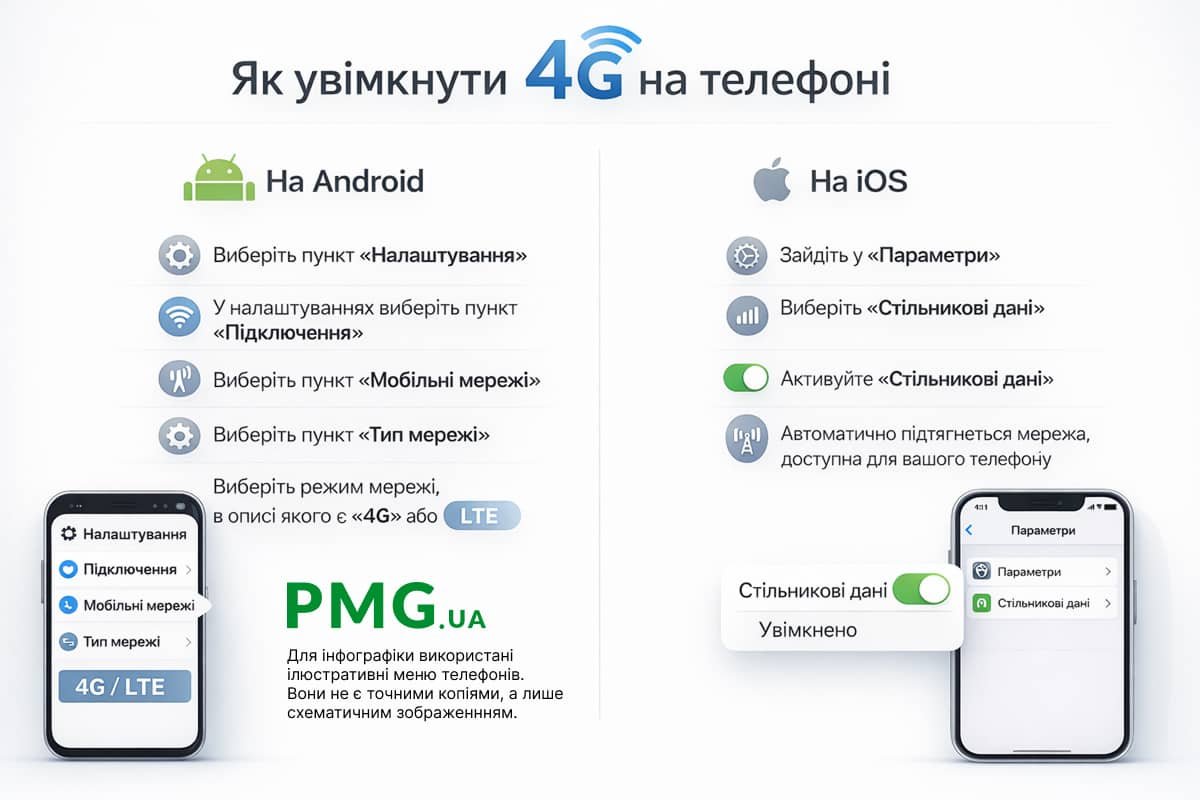 Редактор PMG.ua підготував коротку інфографіку, щоб пояснити увімкнення 4G/LTE на смартфонах Android та iOS.