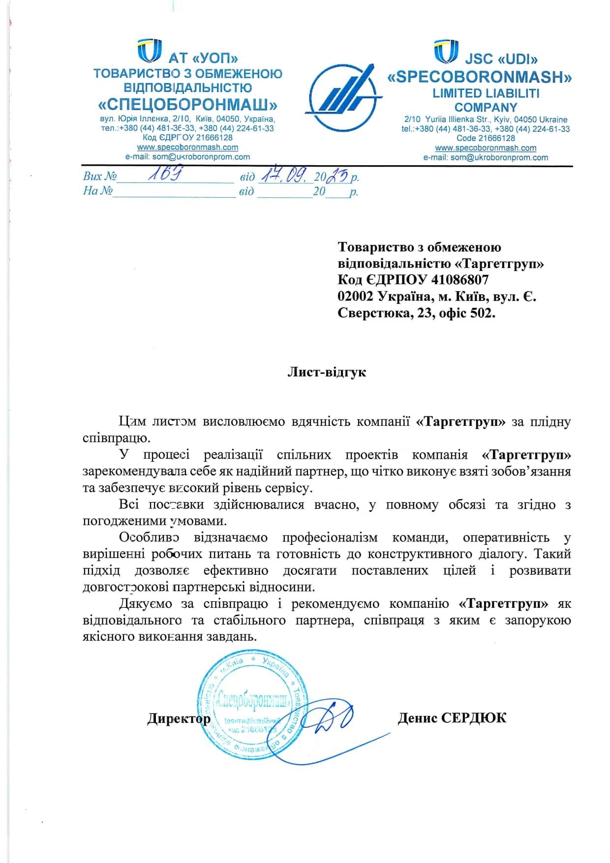 Партнерські відносини з «Спецоборонмаш» і низкою інших підприємств підтверджують практичну ефективність пропозицій ТАРГЕТГРУП. Клієнти відзначають оперативність, відповідальність в постачанні та конструктивну взаємодію при вирішенні технічних задач. Такий підхід дозволяє компанії зміцнювати позиції на внутрішньому ринку та розвивати експортні можливості.