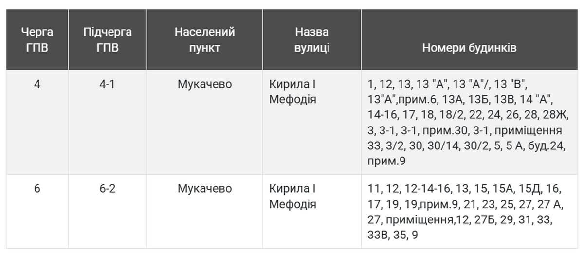 Ось така деталізована інформація з’явиться про відключення, якщо вказати Мукачево та центральну площу міста. Далі споживачеві потрібно знайти свою адресу в одній із двох підчерг.
