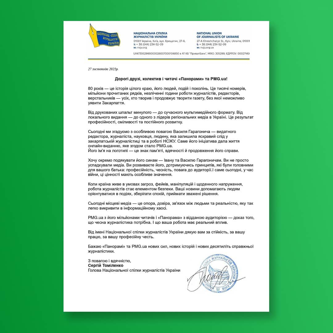 З нагоди ювілею газети «Панорама», редакції надійшов лист з привітанням від голови Національної спілки журналістів України Сергія Томіленка.