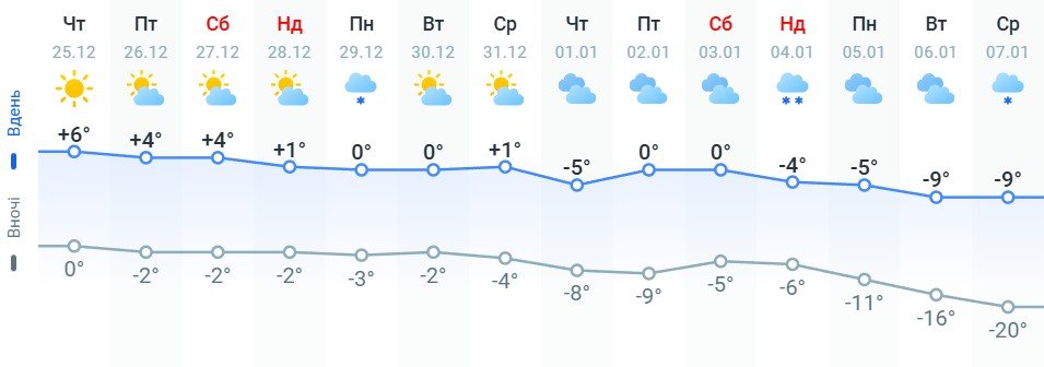 Дані порталу Метеопрог показують, що в деяких регіонах у перший тиждень січня вдарять сильні морози. Наприклад, нічна температура у західних областях опускатиметься до -13… -15 градусів морозу. Вдень так само фіксуватимуть морози – до -3 °C.
