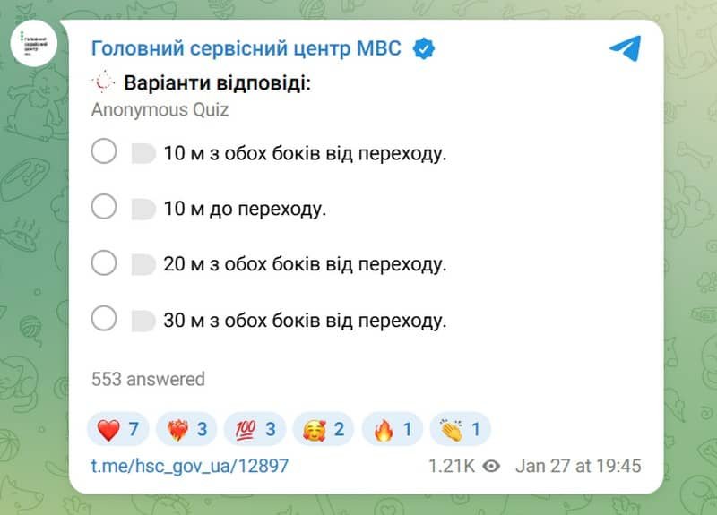 Головний сервісний центр МВС у своєму Telegram-каналі пояснює не тільки зміни й нововведення для водіїв, а й періодично розповідає про ПДР. Одним з методів взаємодії є проведення опитувань, які стосуються практичних випадків із життя керманичів.