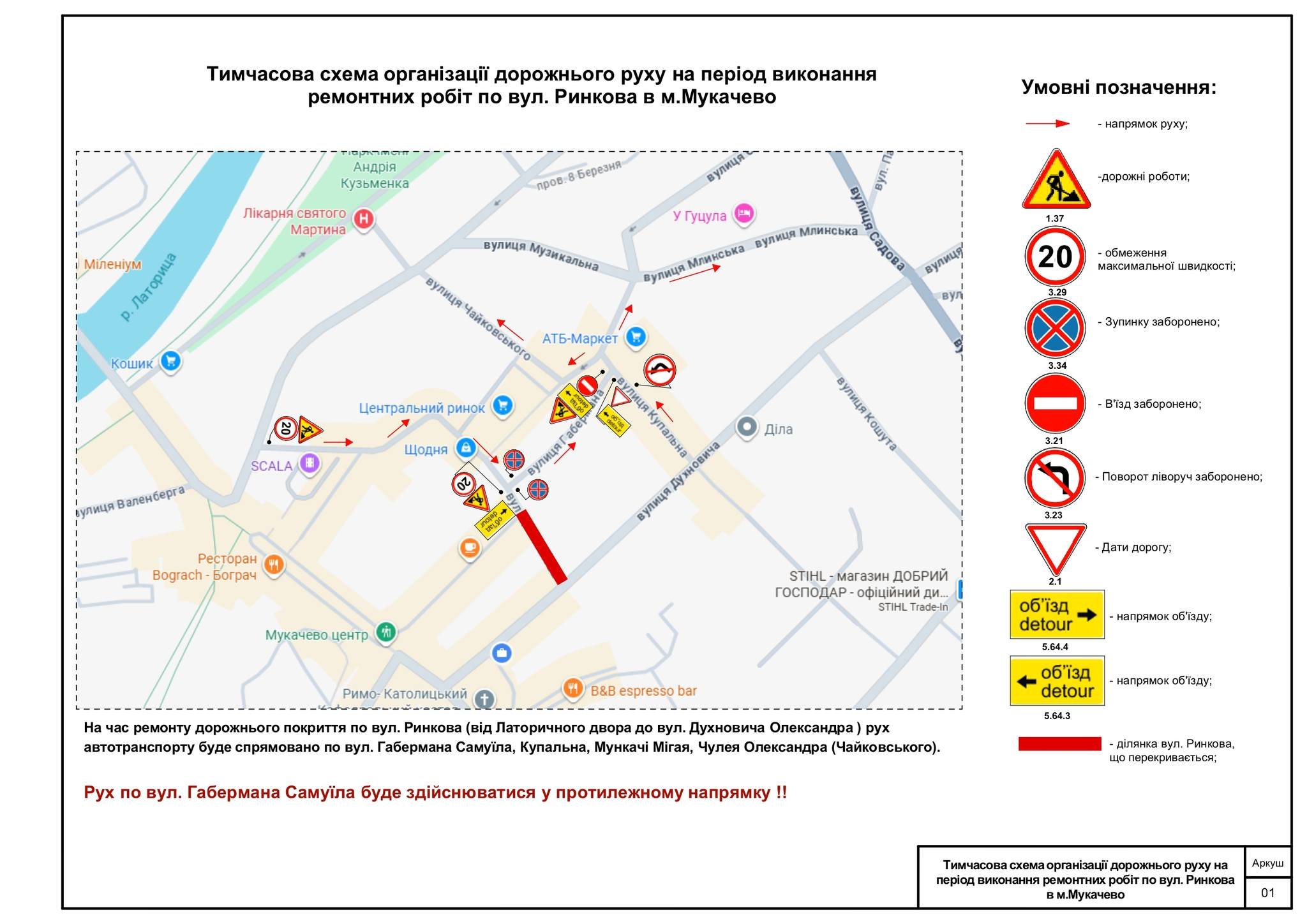 Окремо Управління міського господарства Мукачівської міської ради зазначило, що на вулиці Самуїла Габермана тимчасово змінять організацію дорожнього руху. Автомобілі рухатимуться у протилежному до звичного напрямку. Водіям радять бути особливо уважними, стежити за встановленими дорожніми знаками та враховувати зміни під час планування маршруту.