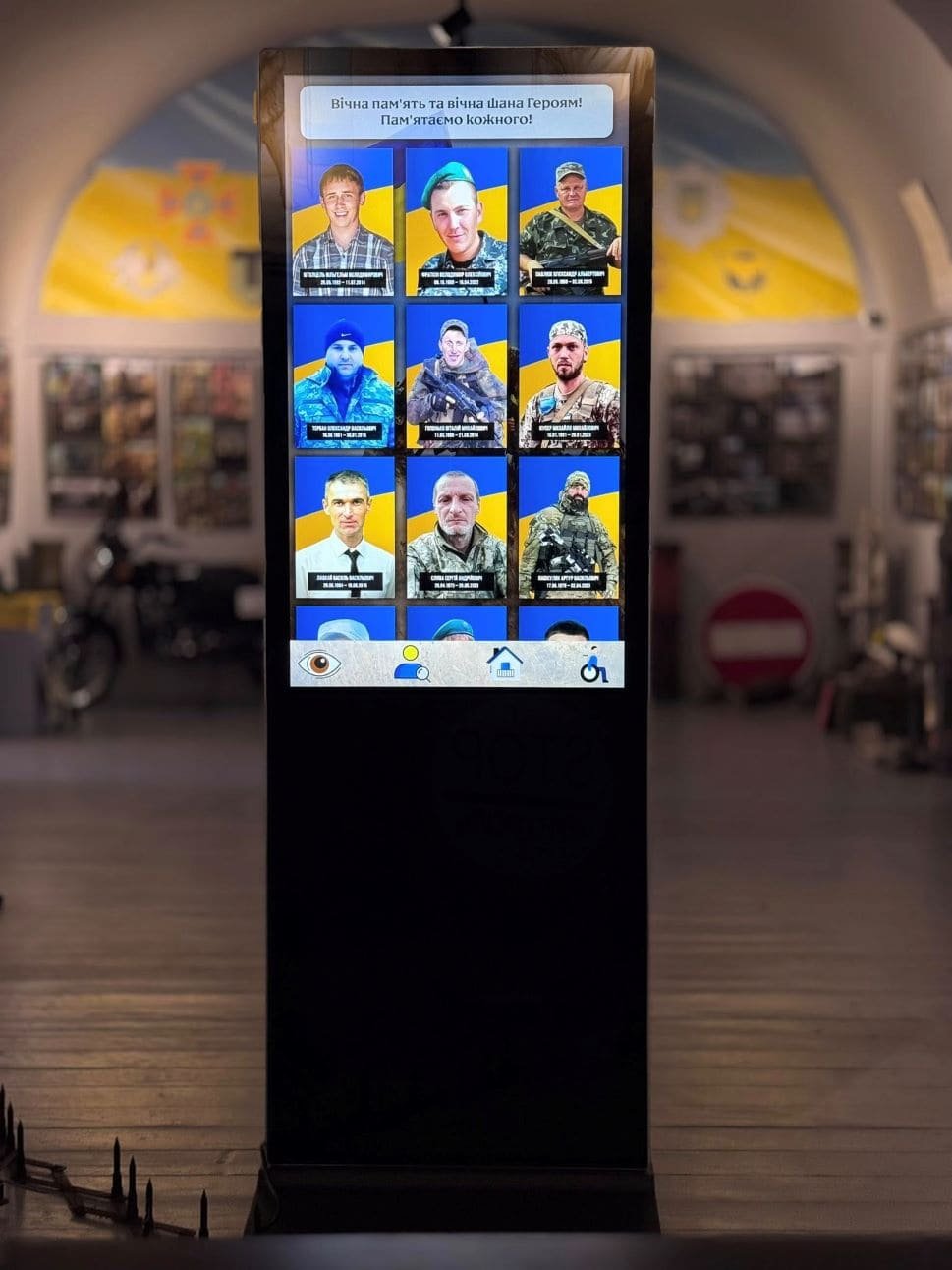 ВІДЕО ДНЯСтруктура кіоску розроблена так, аби кожен відвідувач Музей війни зміг осягнути подвиг захисників через тематичні розділи. Таких створили п’ять — «Галерея слави», «Бойовий шлях легенд», «Жива пам’ять», «Літопис вшанування» і «Символіка пам’яті».