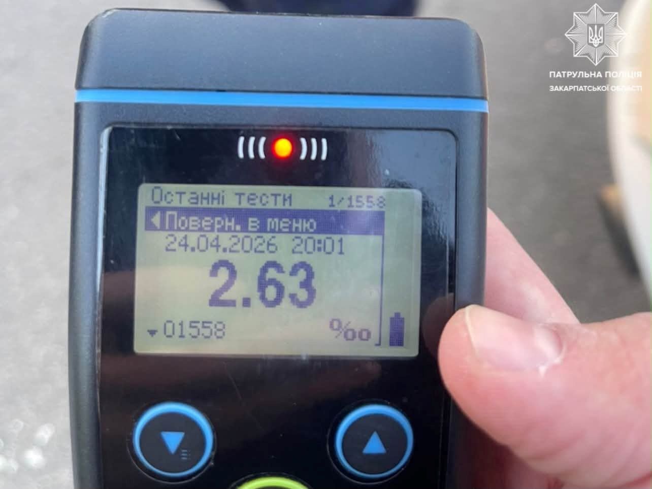 Чоловік пройшов огляд на місці зупинки. Результат тесту приголомшив — 2,63‰ алкоголю в крові. На водія склали два адміністративні протоколи — за порушення правил дорожнього руху, що призвело до ДТП, і керування транспортним засобом у стані сп’яніння.